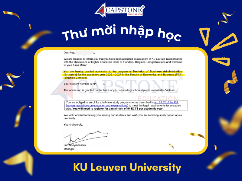 Ngày 24/11/2025, Triều chính thức nhận thư mời nhập học từ KU Leuven University, một trong những đại học danh giá và lâu đời nhất châu Âu. Thành công này minh chứng cho sự chuẩn bị kỹ lưỡng, chiến lược và sự đồng hành chuyên nghiệp của công ty du học Capstone.