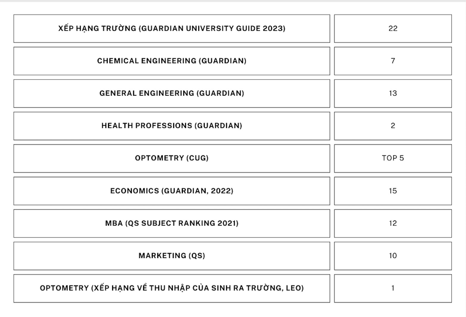 Những ngành học của trường được xếp hàng hàng đầu tại Anh: