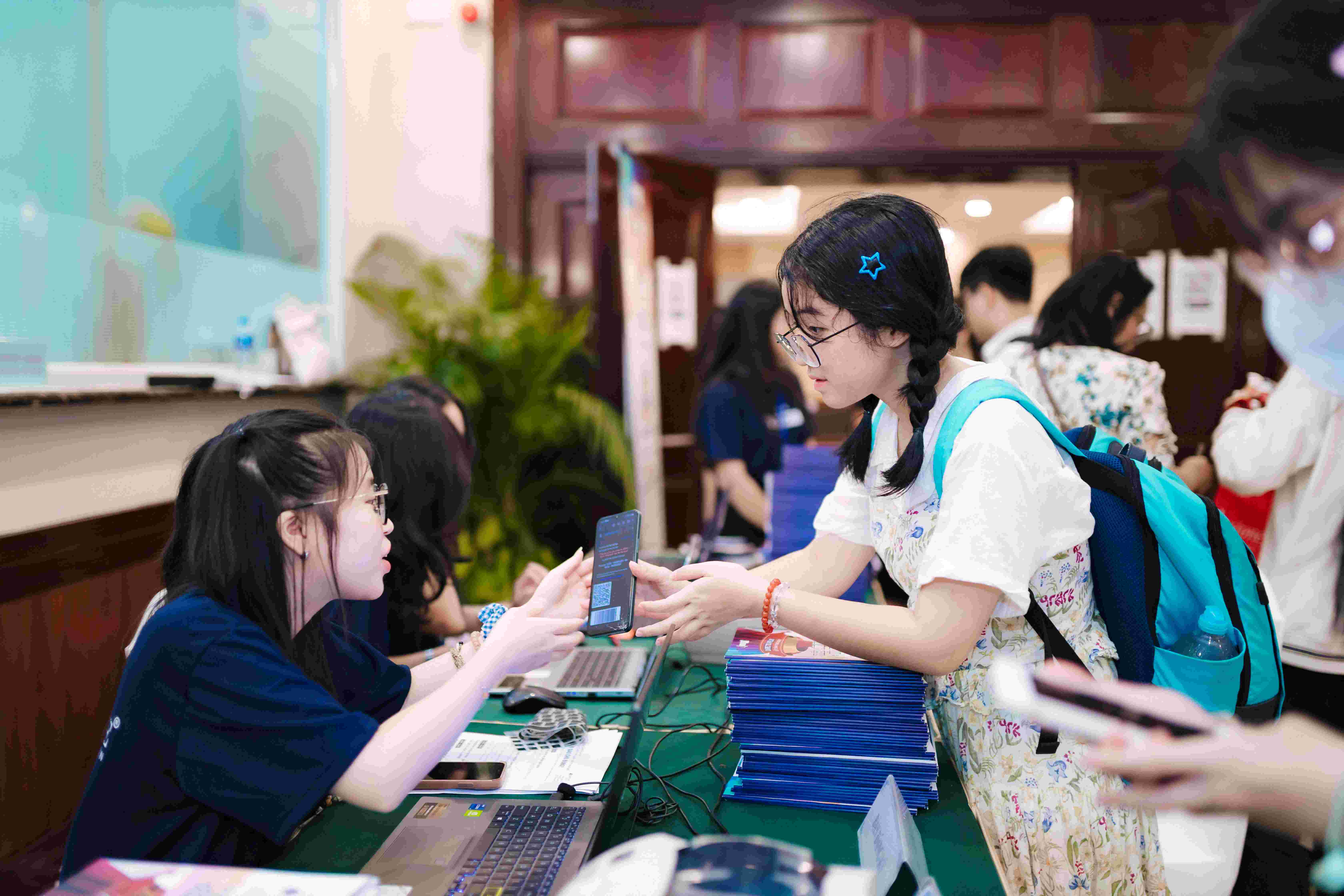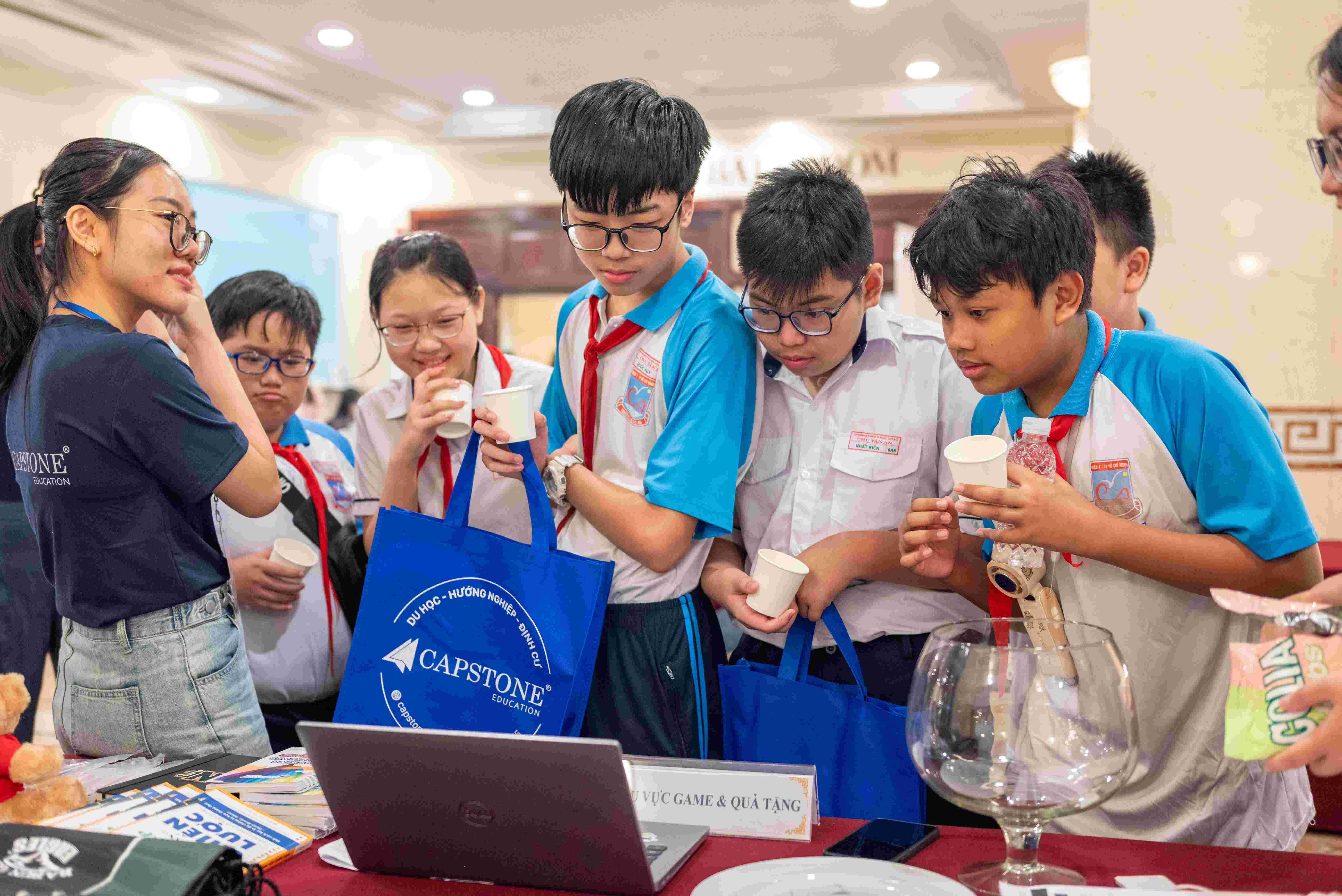 Học sinh check-in và nhận quà tham dự triển lãm của Capstone